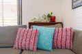 Living area has a large sofa and large Tv . You can watch streaming channels through the chrome cast.