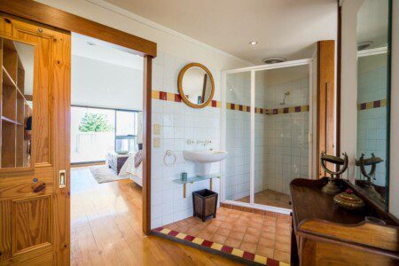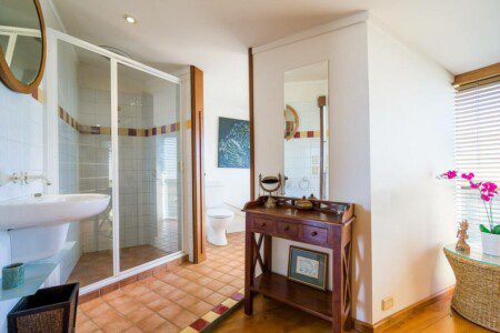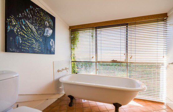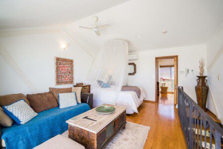 The next flight of stairs takes you to the other queen bedroom and bathroom with a claw foot bath. Also has its own TV and seating area. This bedroom opens out to the ROOFTOP balcony with views of Bathers beach and the Roundhouse.