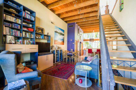 As you enter the apartment you walk up the first flight of stairs to the study and 1st queen sized bedroom/bathroom.